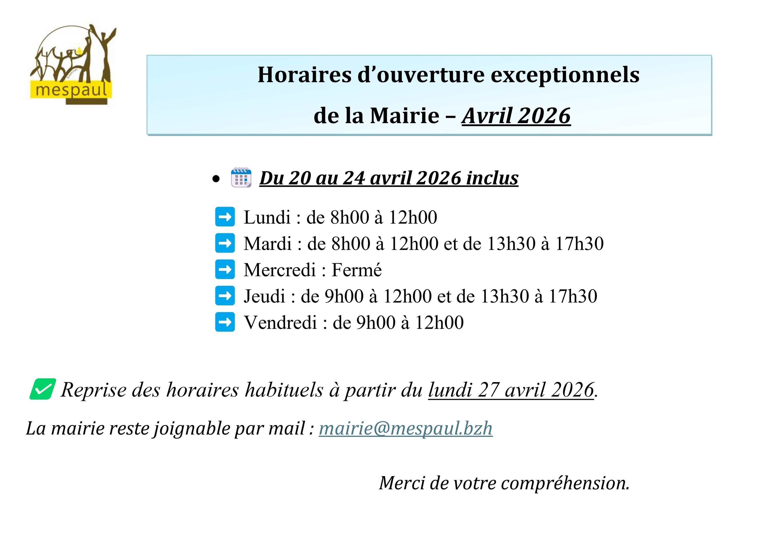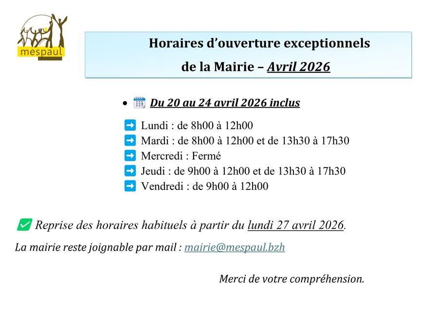 HORAIRES MAIRIE - 20 AU 24 AVRIL 2026