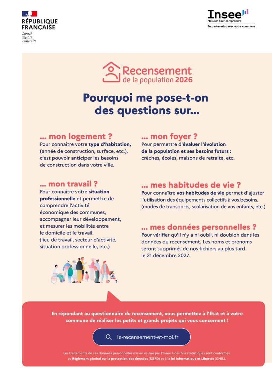 𝐀̀ 𝐩𝐚𝐫𝐭𝐢𝐫 𝐝𝐮 𝟏𝟓 𝐣𝐚𝐧𝐯𝐢𝐞𝐫 𝟐𝟎𝟐𝟔, tous les logements et habitants de la commune seront recensés.