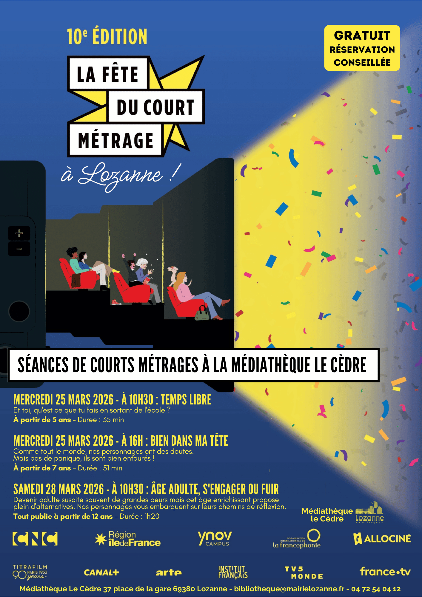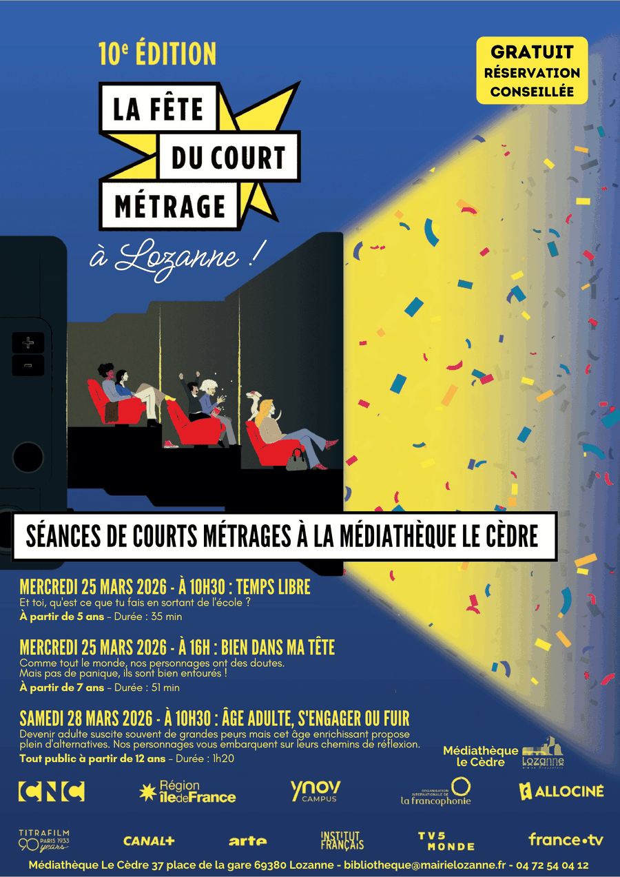 La médiathèque de Lozanne vous propose, pour adultes et enfants, des séances gratuites de projection de courts métrages, à l'occasion de la Fête du court métrage !