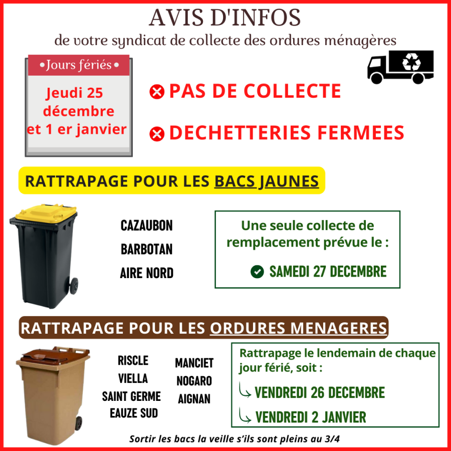 > La collecte des ordures ménagères se fera le lendemain de chaque jour férié soit le vendredi 26 décembre et le vendredi 2 janvier