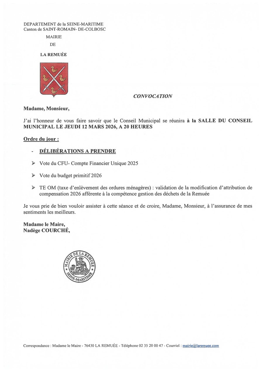 Le conseil municipal initialement prévu le mardi 3 mars 2026 est reporté au jeudi 12 mars 2026 à 20h00.
