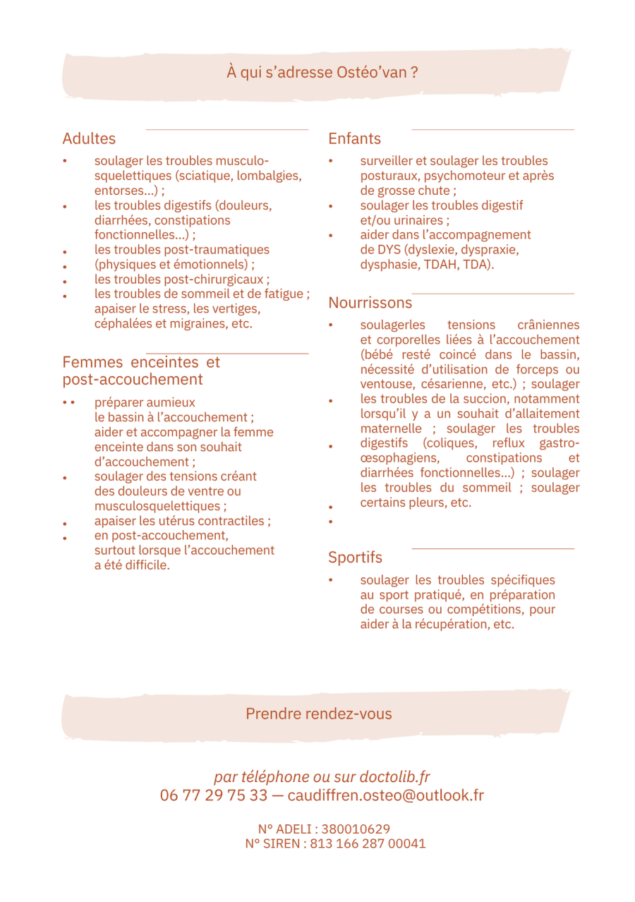 Coordonnées de Chloé AUDIFFREN : 06 77 29 75 33 ou caudiffren.osteo@outlook.fr