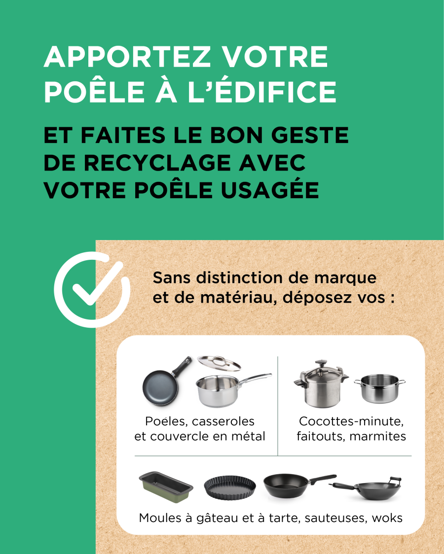 Les déchèteries du territoire sont maintenant équipées de nouveaux contenants, pour vous permettre de trier vos produits usagés. Vous pouvez y déposer vos poêles, casseroles, faitouts, marmites, sauteuses, woks et cocottes-minute.