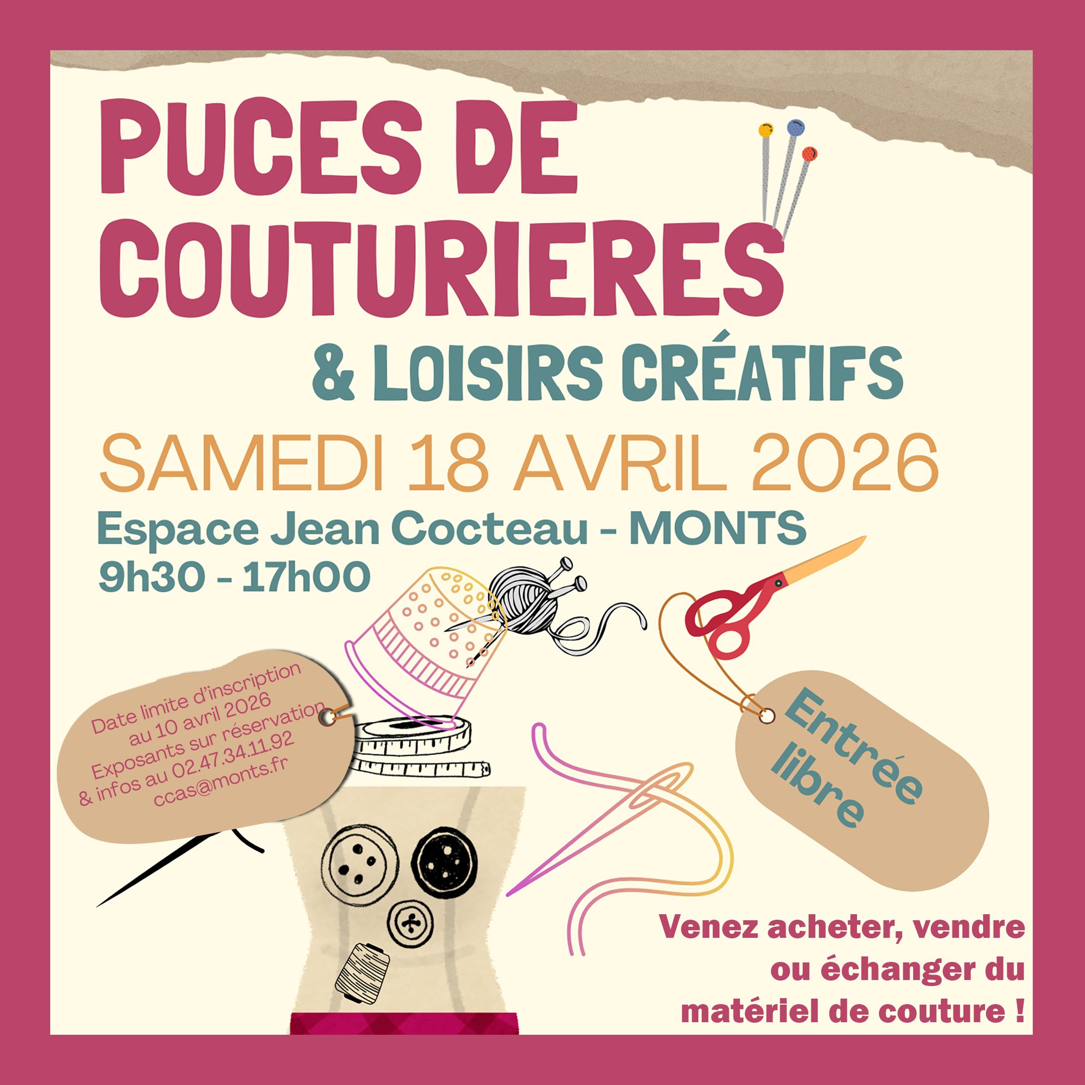 🪡 Le CCAS de la Ville de Monts donne rendez-vous aux fans de loisirs créatifs ou amateurs de couture et autres travaux d’aiguille faits maison :