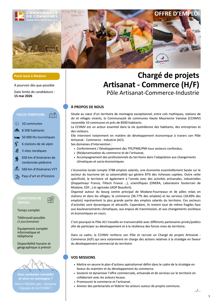 ⛰️ La Communauté de communes Haute Maurienne Vanoise recrute un(e) Chargé(e) de projets Artisanat - Commerce (H/F) !