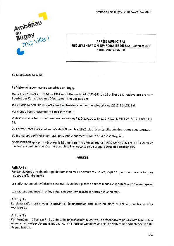 le stationnement sera interdit sur - - les 4 places de zone bleue situées face au 7 rue Aimé Vingtrinier ,