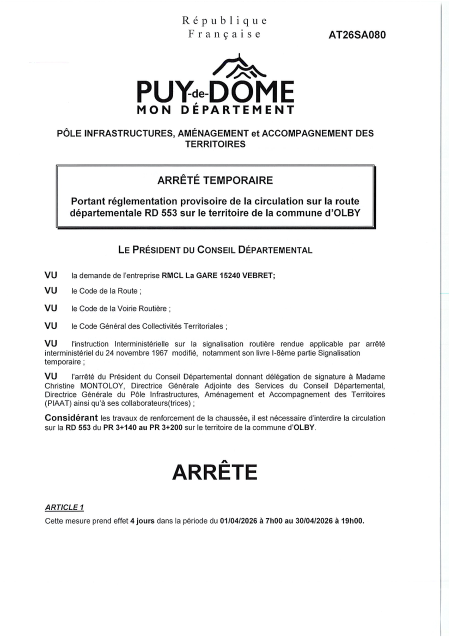 Dans le cadre du chantier RD 553 - vous trouverez ci-dessous l'arrêté de circulation temporaire du conseil départemental du Puy-de-Dôme.