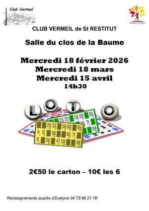 Vous trouverez ci-dessous les dates des lotos organisés par le Club Vermeil dans la salle du Clos de la Baume.