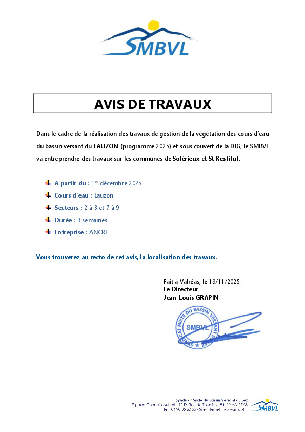 vous informe de travaux sur le bassin versant du Lauzon à partir du 1er décembre.