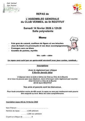 Le Club vermeil vous propose un repas à l'issue de son Assemblée Générale