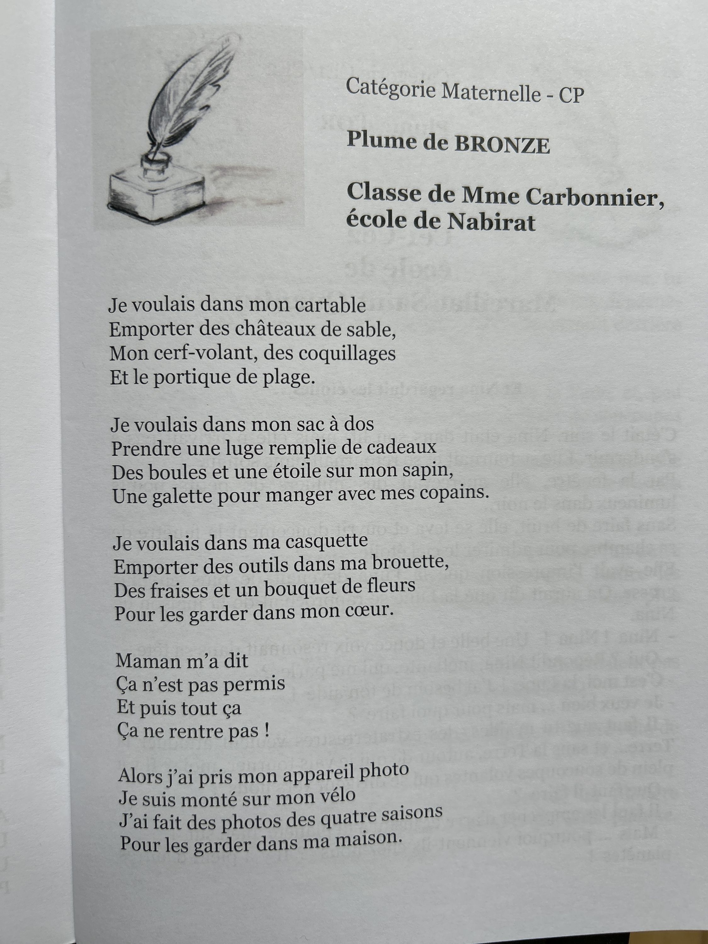 Félicitations aux Enfants de l’Ecole maternelle de Nabirat et à Maîtresse Karine… Cette année encore, ces derniers ont été récompensés lors de la remise des prix du Concours d’écriture « l’image et l’imaginaire ». Ils ont reçu la plume de bronze pour leur joli texte, que nous vous ferons partager au plus vite.