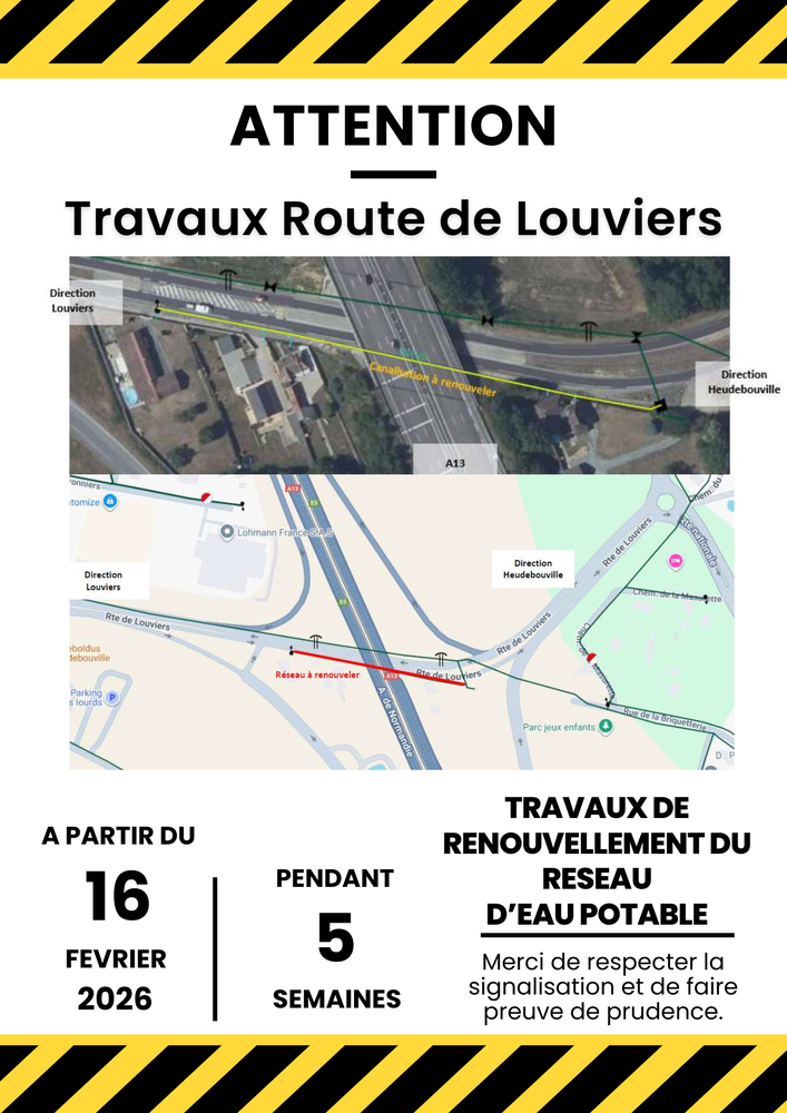 📅 à partir du 16 février pour une durée estimée de 5 semaines, sur l’accotement de la route de Louviers (devant les propriétés).