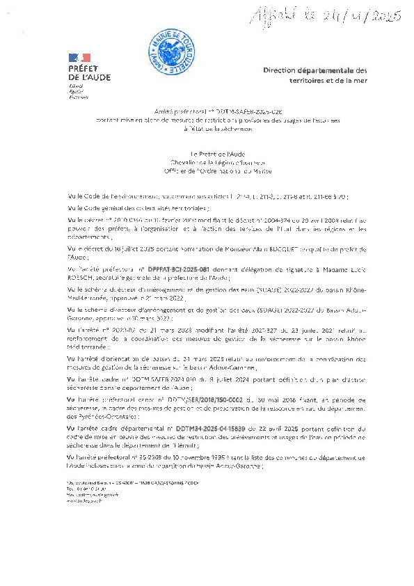 Arrêté portant mise en place de mesures de restrictions provisoires des usages de l'eau liées à l'état de sécheresse.