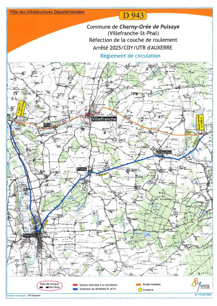 En raison de travaux de réfection de la couche de roulement sur la D943, opérés par le département, la circulation sera interdite à tous véhicules de jour comme de nuit