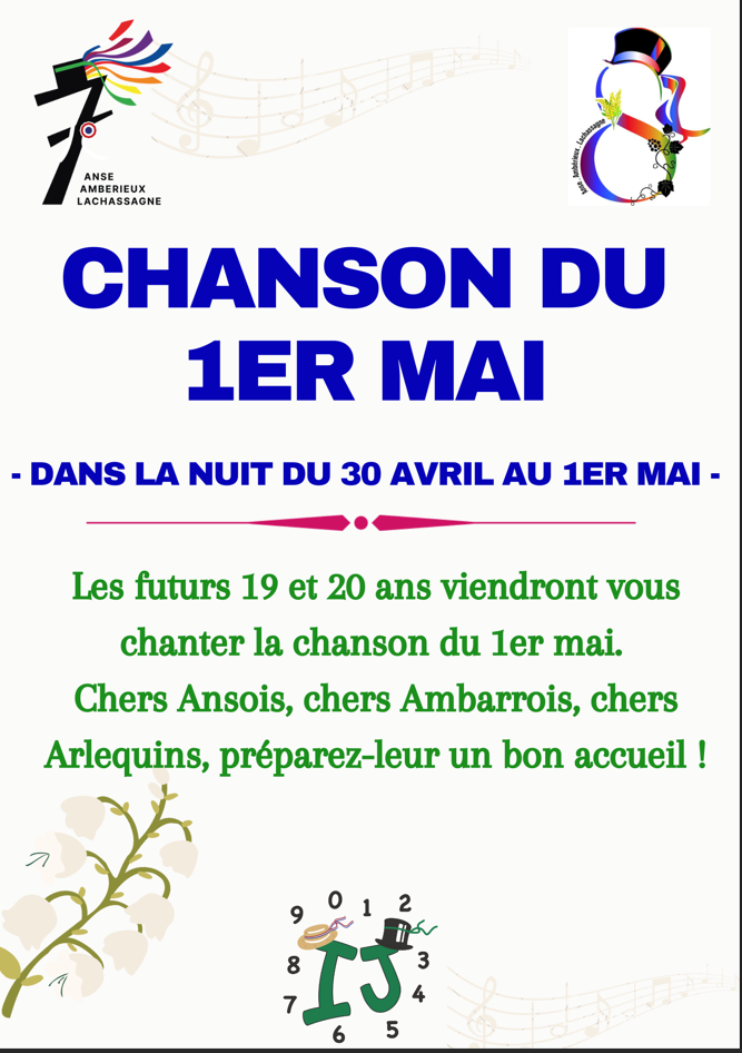 Comme chaque année les futurs 19 et 20 ans viendront chanter la chanson du 1er mai de portes en portes le soir du 30 avril.