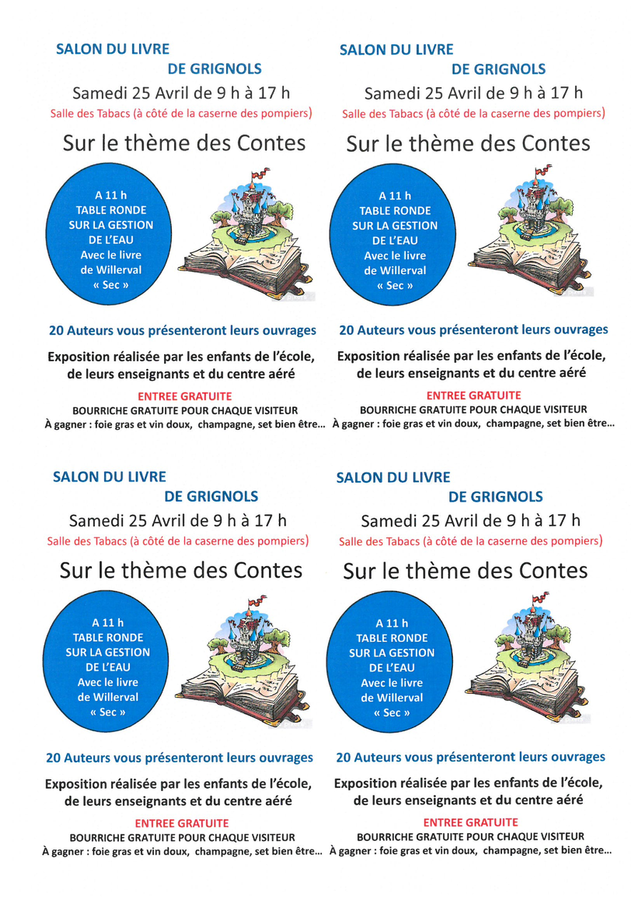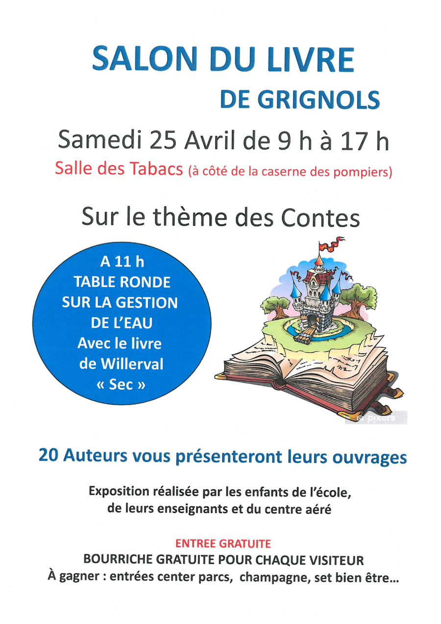 Le 25 Avril, de 9h à 17h, le salon du livre vous ouvre ses portes, à la salle des Tabacs, à Grignols bien sûr, sur le thème des CONTES.