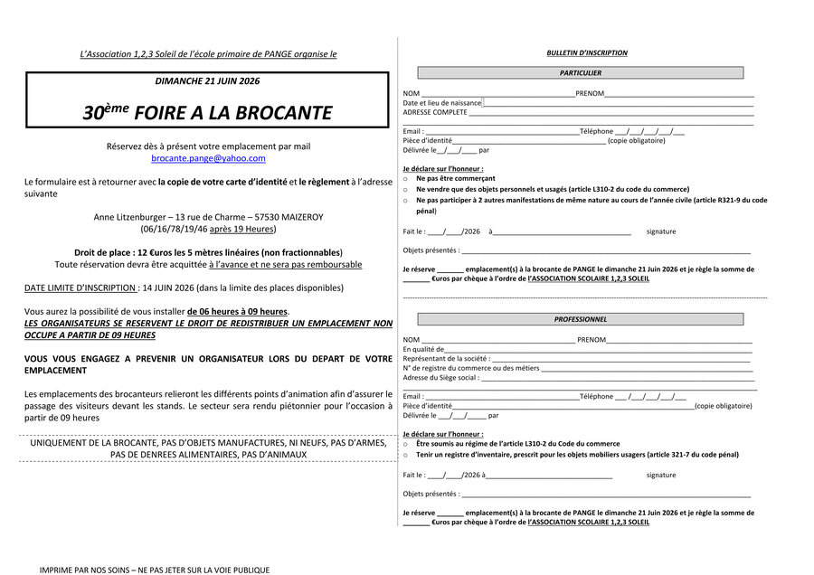 Brocante à PANGE LE 21 JUIN 2026