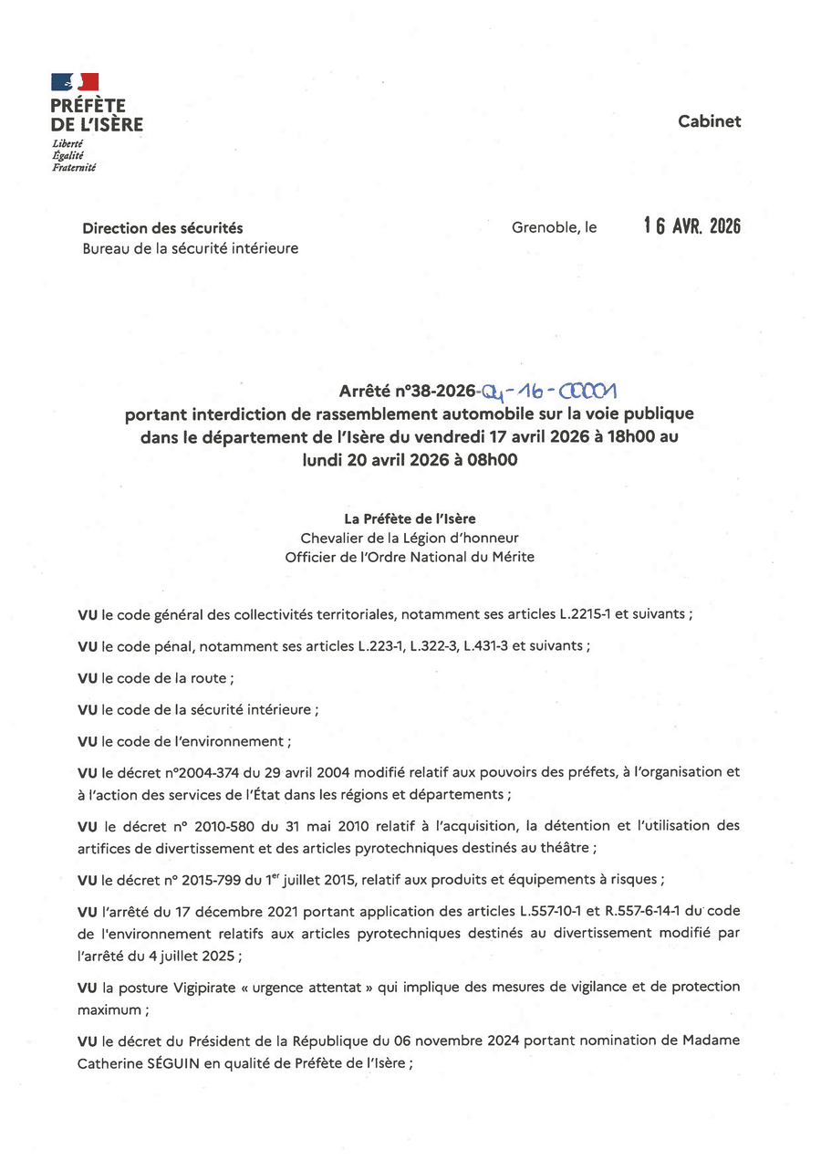 Interdiction de rassemblement automobile du vendredi 17 avril 18h au lundi 20 avril 8h à l'ensemble du territoire du département de l'Isère