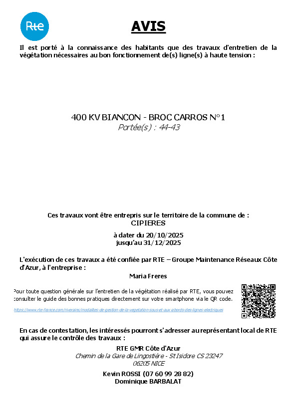 Pour toute question générale sur l’entretien de la végétation réalisé par RTE, vous pouvez consulter le guide des bonnes pratiques en cliquant sur le lien suivant (en utilisant CTRL+clic gauche): GESTION DE LA VEGETATION