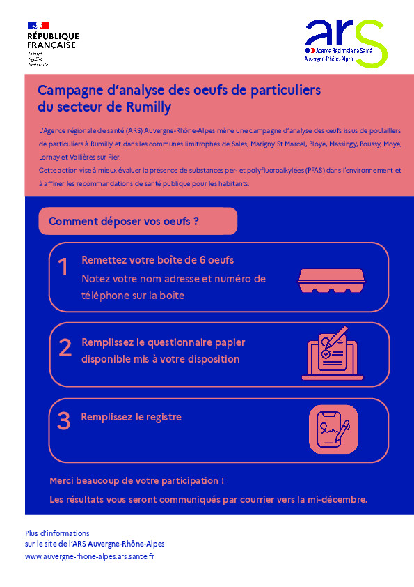 L’Agence régionale de santé Auvergne-Rhône-Alpes (ARS) mène actuellement une enquête dans plusieurs communes à Rumilly et dans les communes limitrophes afin d’évaluer la présence éventuelle de PFAS (substances per- et polyfluoroalkylées) dans les œufs issus de poulaillers de particuliers.