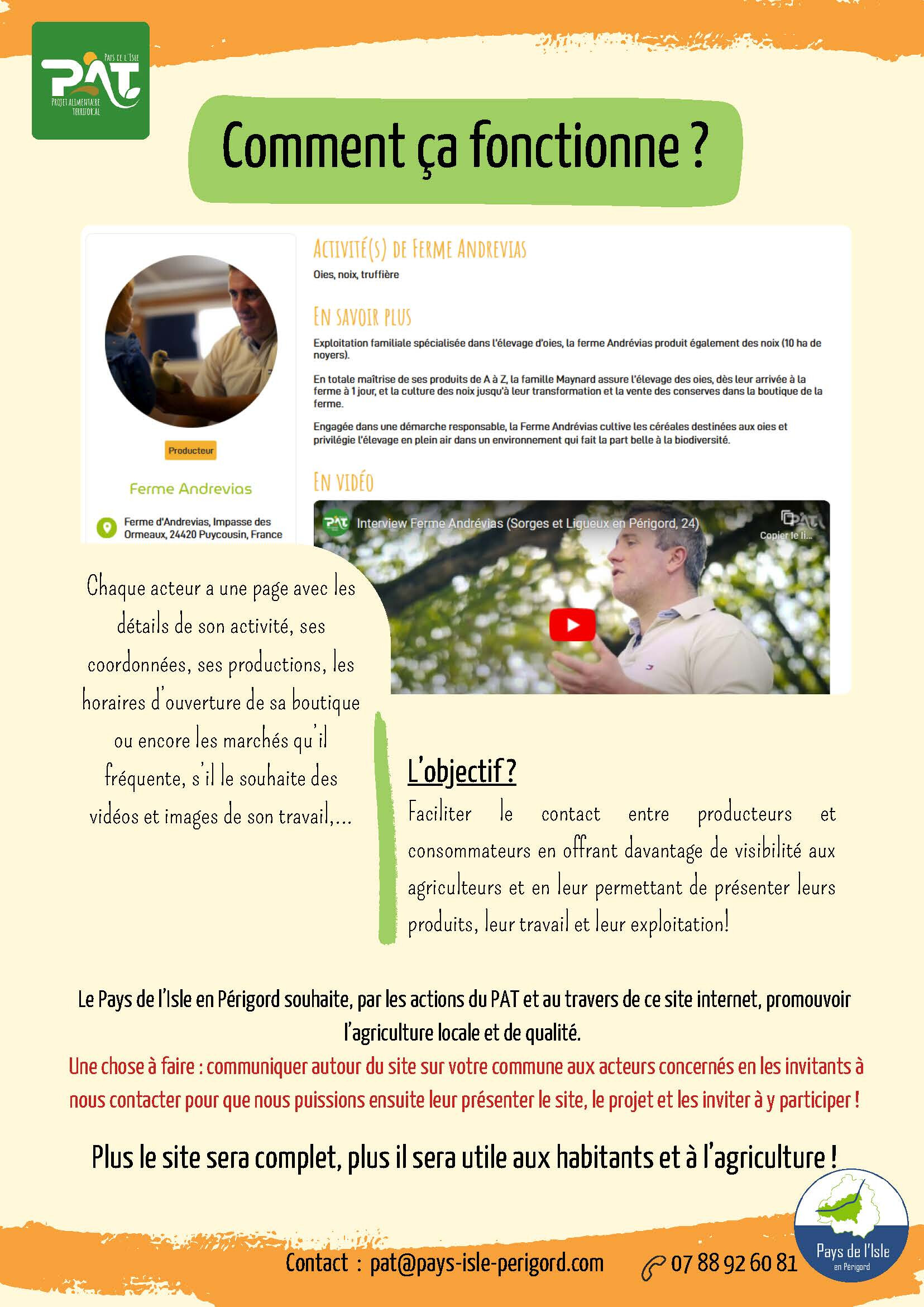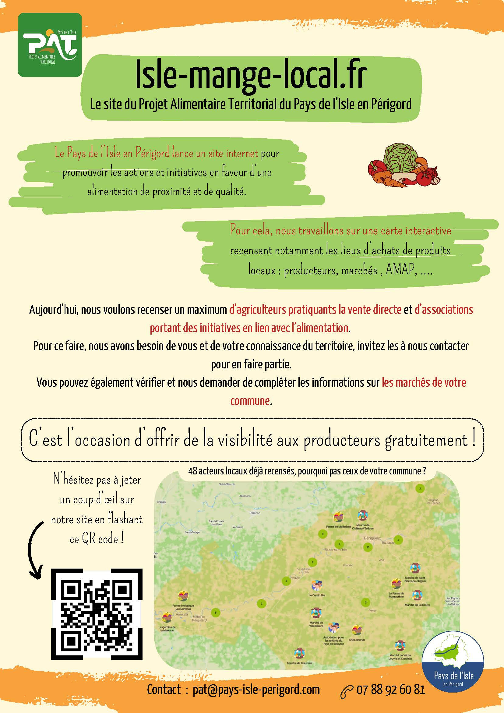 Le Pays de l’Isle en Périgord lance un site internet « isle-mange-local.fr » pour promouvoir les actions et initiatives en faveur d’une alimentation de proximité et de qualité. Cette carte interactive recense les lieux d’achats de produits locaux : producteurs, marchés, AMAP ; etc.