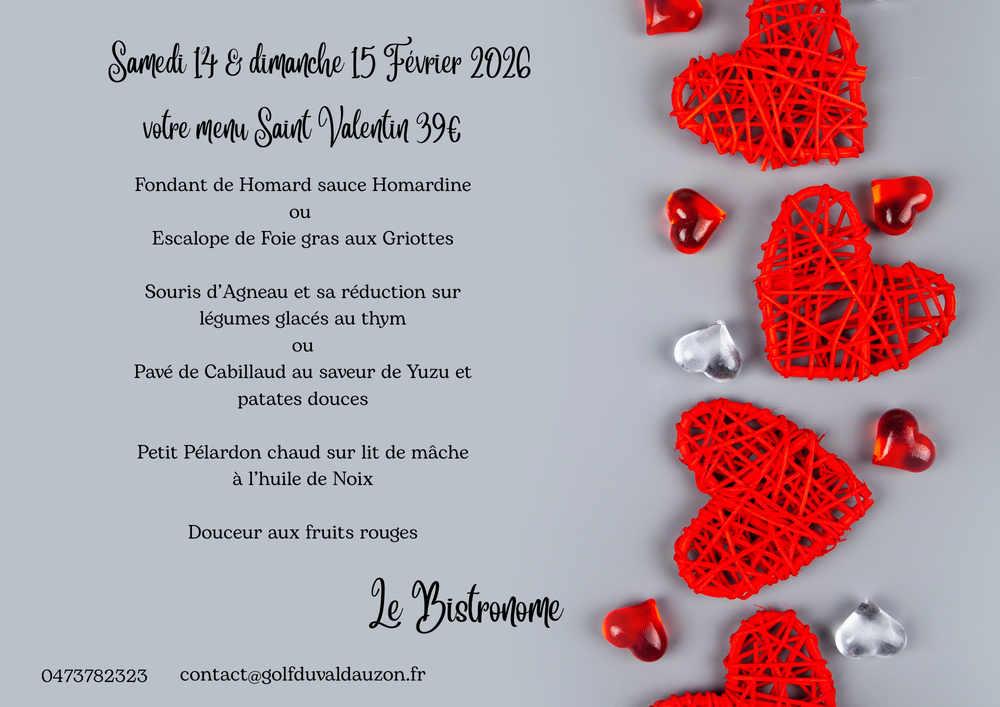 Célébrez la Saint-Valentin autour du menu gourmand proposé par Le Bistronome au Golf de l’Auzon.