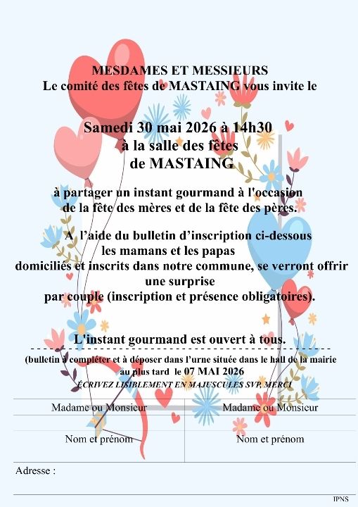 Les bénévoles du comité des fêtes vous invitent à vous inscrire puis vous donnent rendez-vous le samedi 30 mai à 14h30 à la salle des fêtes.