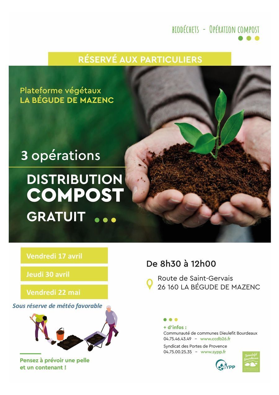 - La Bégude-de-Mazenc : à la plateforme végétaux, Route de St Gervais (ouverture exceptionnelle de la plateforme aux particuliers, pour la distribution uniquement).