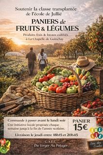 Dans le cadre du financement de la classe transplantée de l’école de Jullié, le Sou des Écoles et les représentants de parents lancent une vente hebdomadaire de paniers de fruits et légumes.