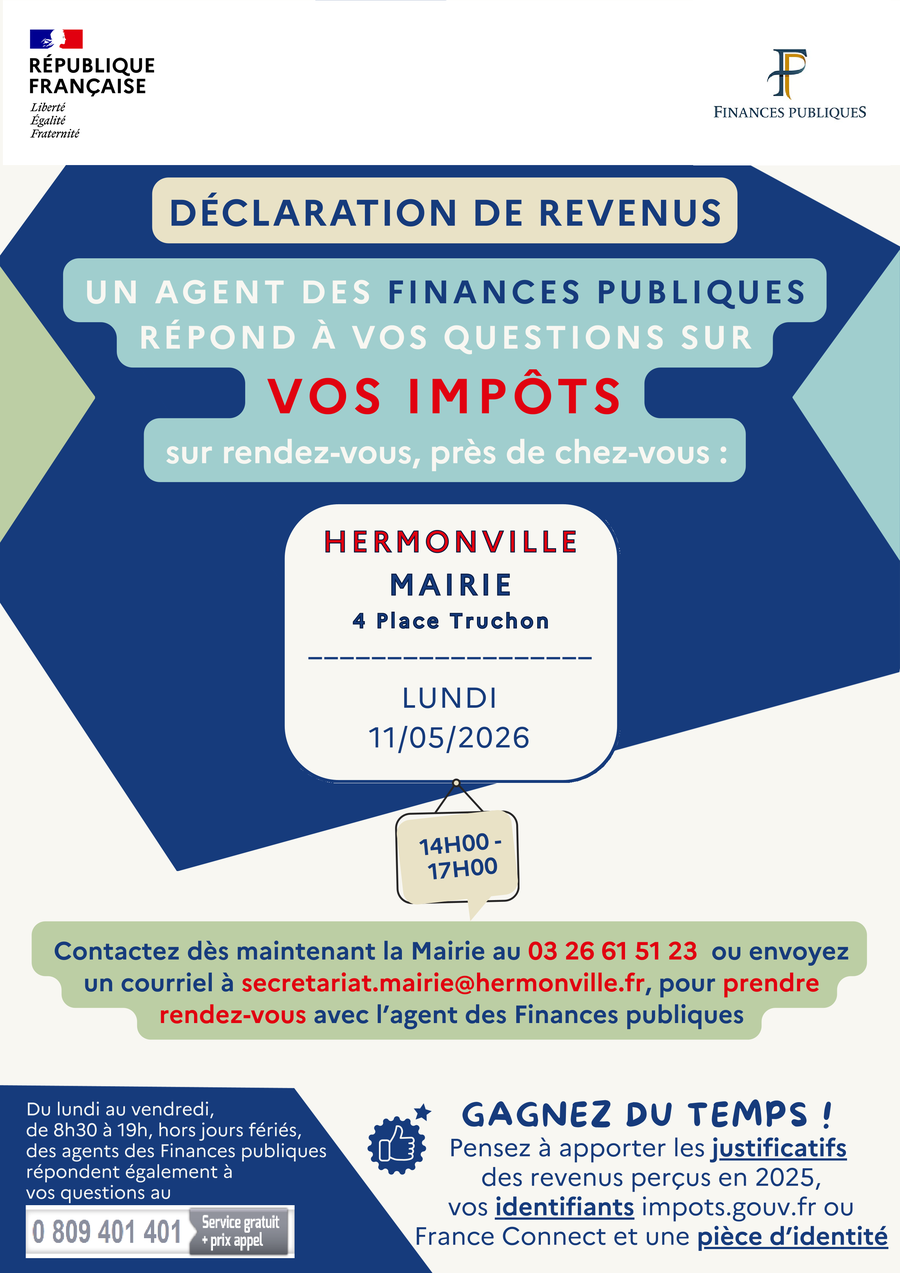 Dans ce cadre et comme chaque année, un agent des Finances publiques assurera une permanence en Mairie d'Hermonville pour répondre aux questions des usagers qui rencontrent des difficultés dans leurs démarches déclaratives.