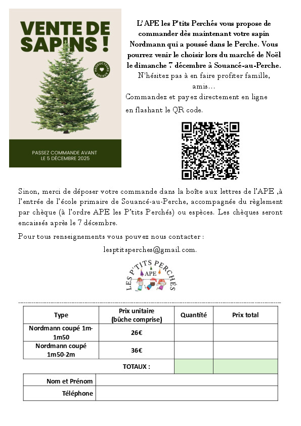 L’Association des parents d’élèves de l’école primaire de notre Regroupement Pédagogique Souancé-Trizay-Vichères vous propose pour Noël, des sapins Nordmann qui ont poussé dans le Perche.