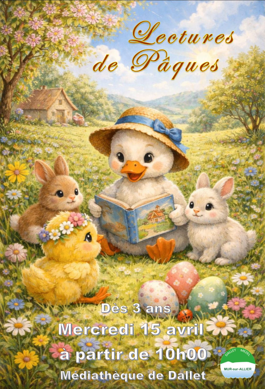 🐣 L’équipe de la médiathèque de Dallet vous propose « les lectures de Pâques ». Ces lectures animées sont prévues le 15 avril 2026 à la médiathèque de Dallet à partir de 10h.