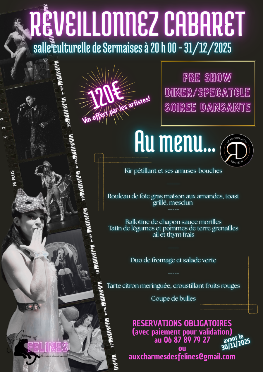 Tarif unique : 120€ comprenant apéritif/repas/vin/spectacle et soirée dansante!
