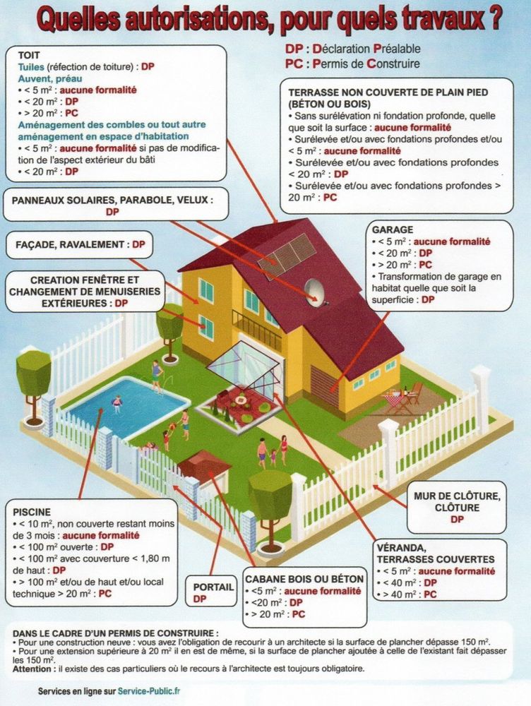 💡 Selon l’importance des travaux, il faut déposer un permis (permis de construire, d’aménager, de démolir) ou une déclaration préalable.