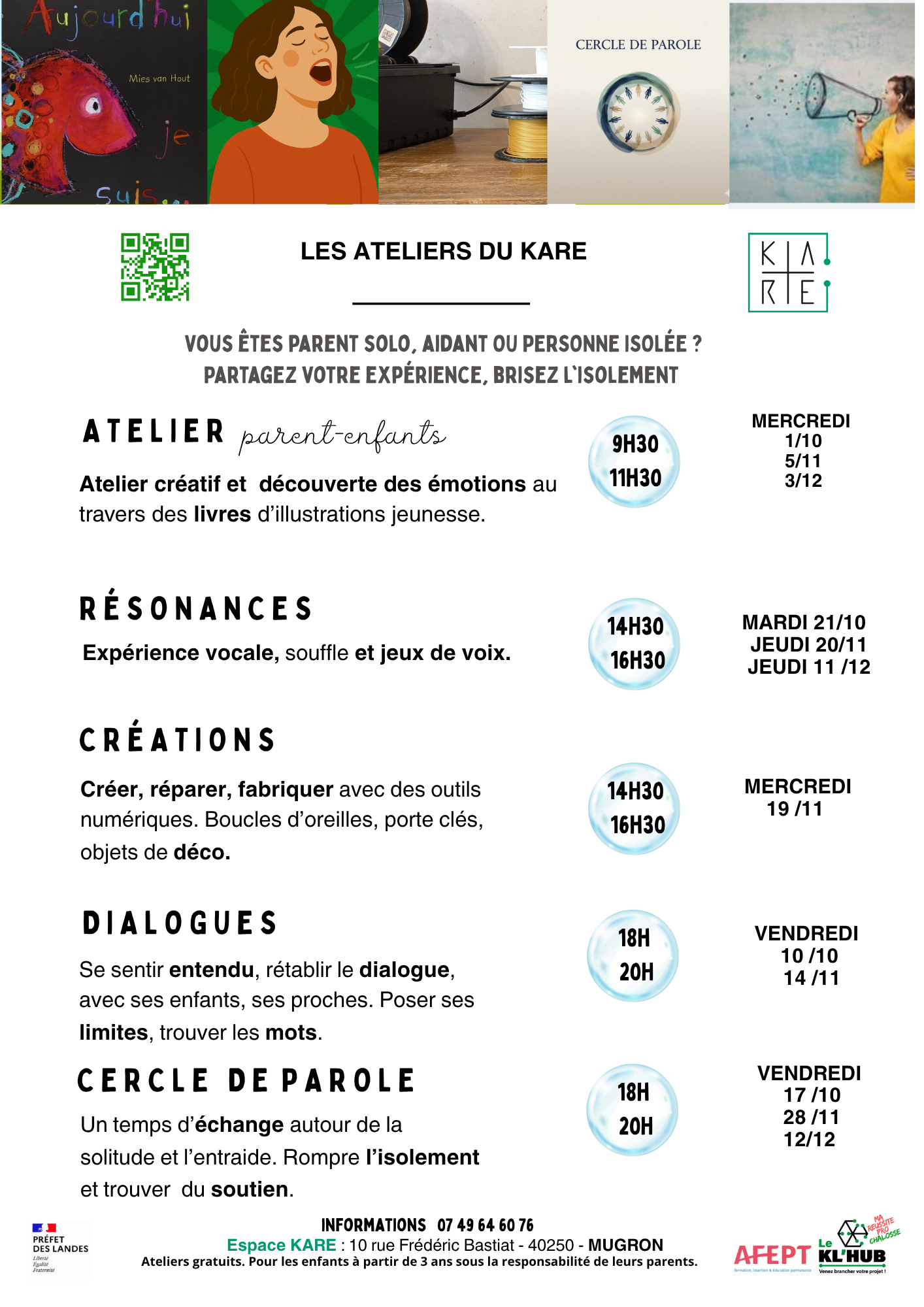 Les ateliers sont gratuits et ouverts à toutes les personnes en situation d’aidance ou d’isolement. Ils se déroulent au KL’HUB de Mugron et sont animés par des intervenants professionnels de l’accompagnement :