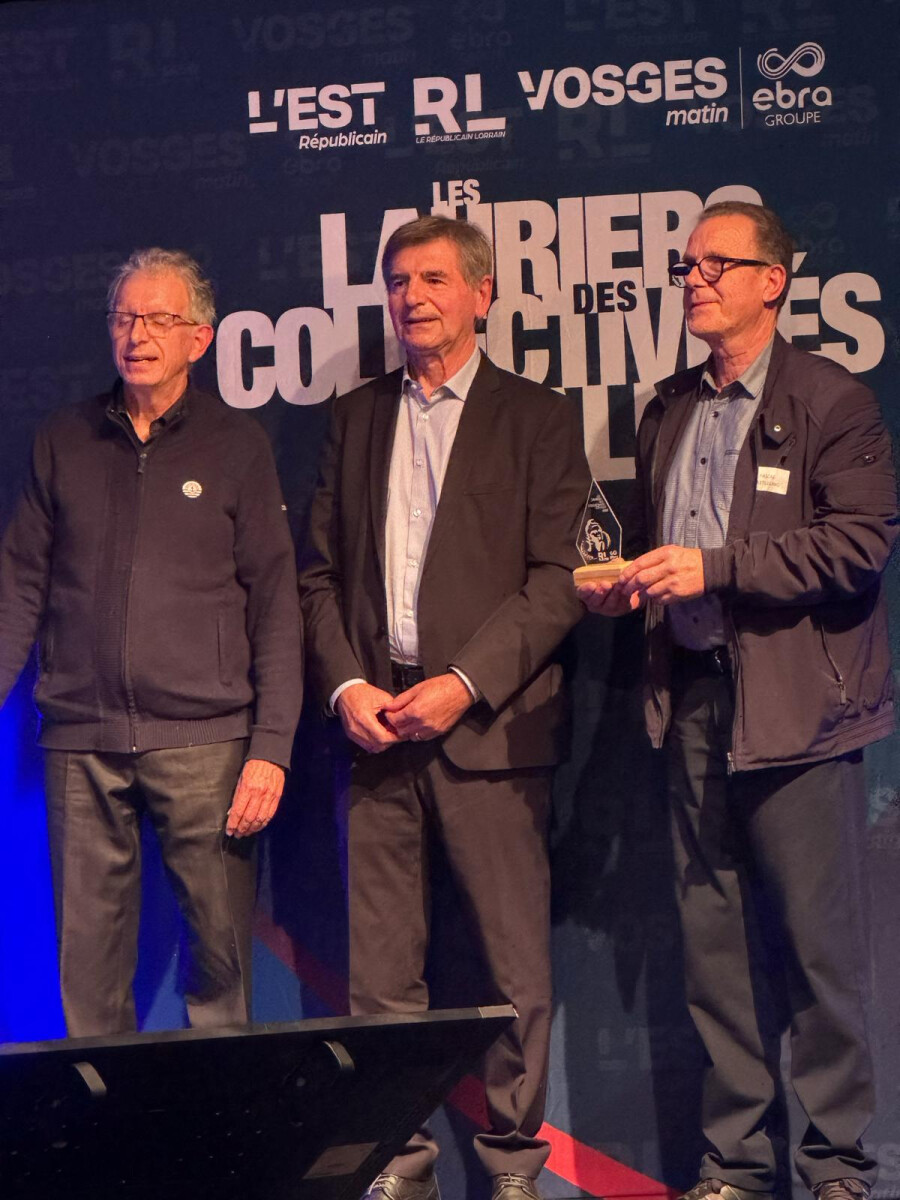 Le sénateur Mizzon, président de l'Association des maires ruraux de la Moselle, remet le prix Culture et Sport à Christian Walker et Pascal Dastillung, adjoints au maire de Fénétrange.