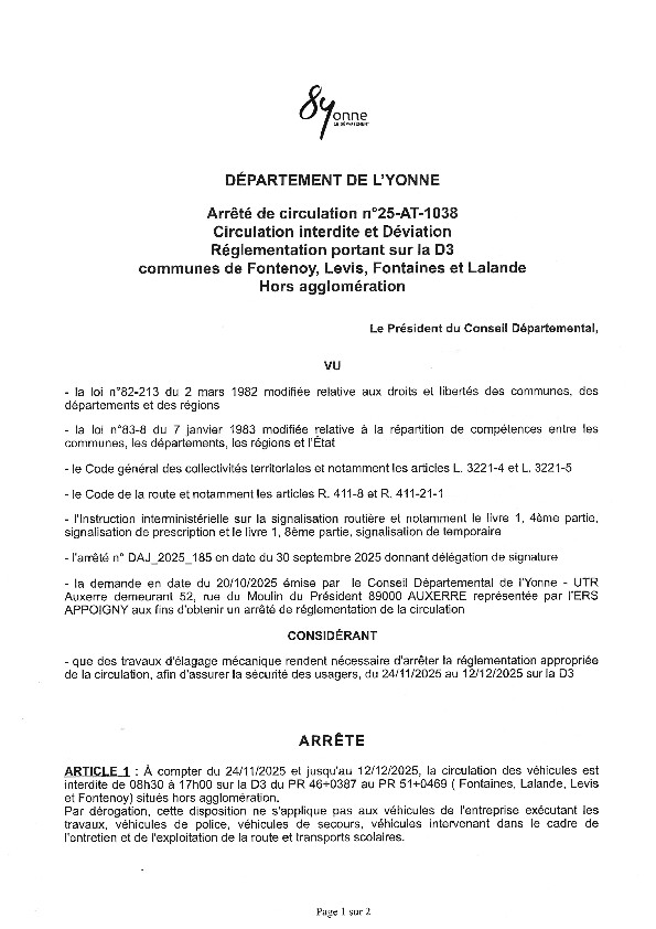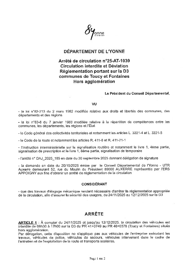 La route D3 allant de Toucy à Fontenoy sera coupée pendant la période du 24 novembre au 12 décembre 2025.
