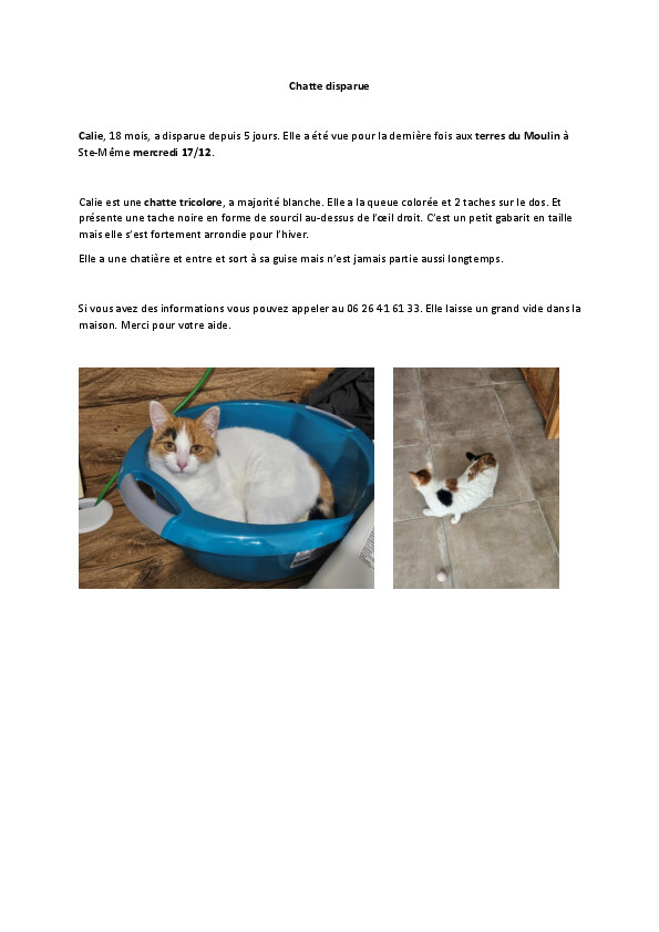 📞 Si vous l’apercevez, merci de contacter la mairie ou d’appeler le 07 60 22 47 08.