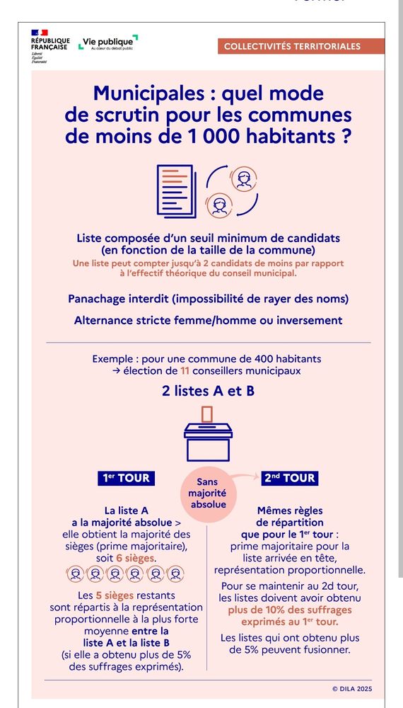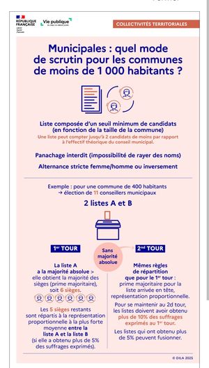 En application de la loi du 21/05/2025, les élections municipales des communes de moins de 1000 habitants se déroulent selon un mode de scrutin de liste paritaire.