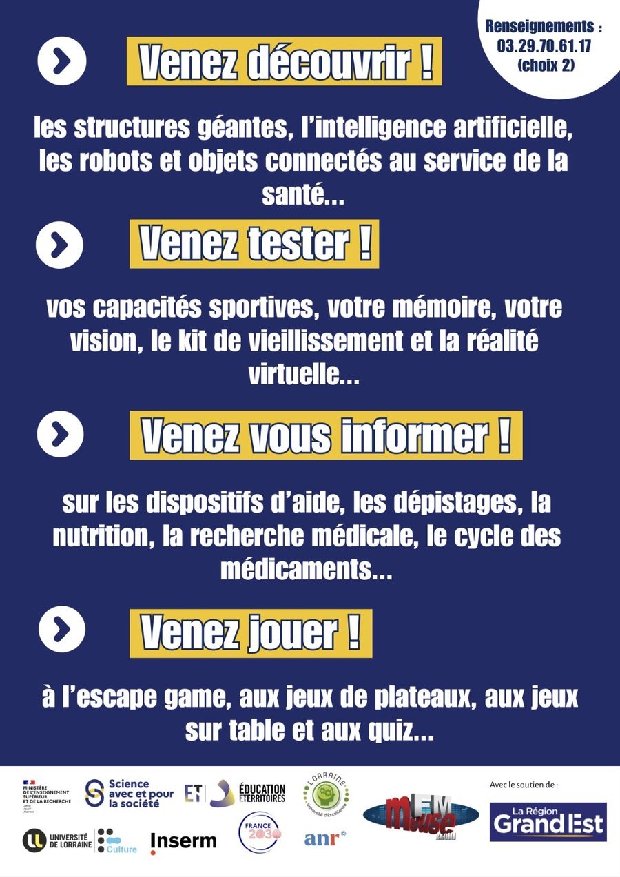 📌 Plus de 25 structures seront représentées : Ligue contre le cancer -côlon tour, e-Meuse santé, Addictions France, Psmi, Service autonomie du Département, Infirmières Azalée, MSA, maison géante pour enfant, Team Meuse Triathlon – défis sportifs…et pleins d’autres !