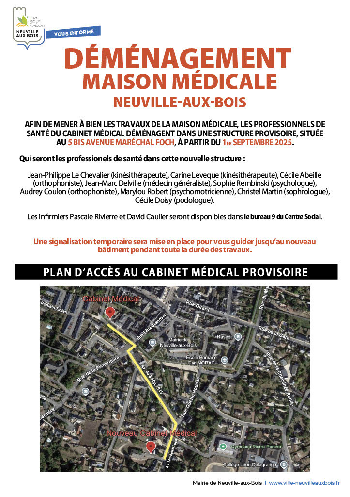 Les professionnels de santé déménagent dans une structure provisoire située au 5 bis Avenue Maréchal Foch dès le 1er septembre.
