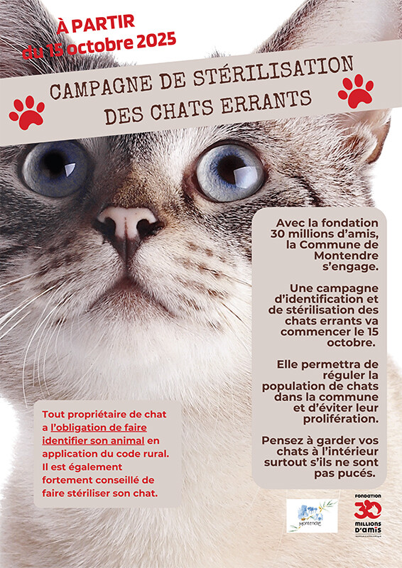 en partenariat avec 30 millions d'amis, la Commune de Montendre lance une campagne de stérilisation et d'dentification des chats errants.