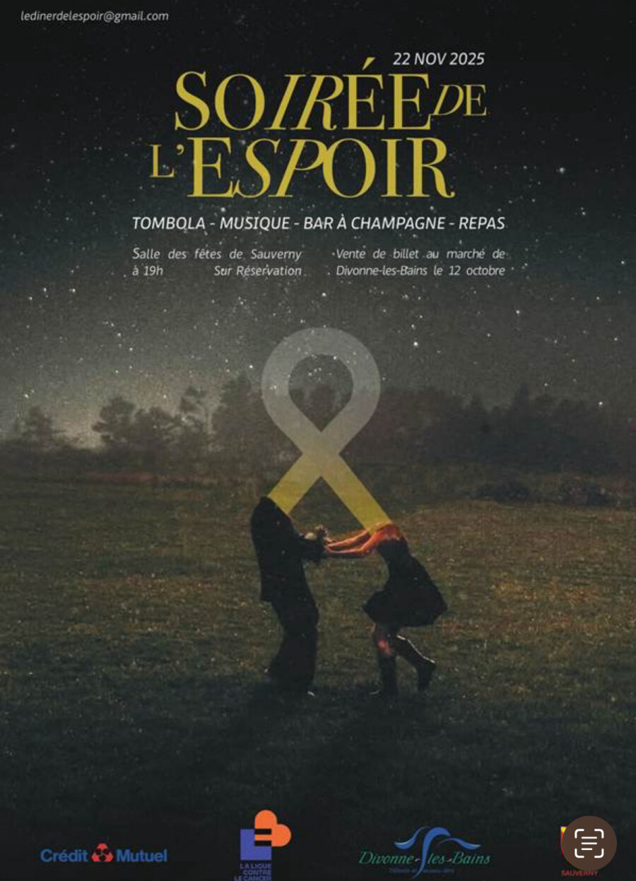 La dĂ©lĂ©gation du pays de Gex de la Ligue Nationale contre le cancer vous invite Ă la soirĂ©e de lâespoir qui se tiendra le 22 novembre Ă 19h Ă la salle des fĂȘtes Georges Bonnefoy.