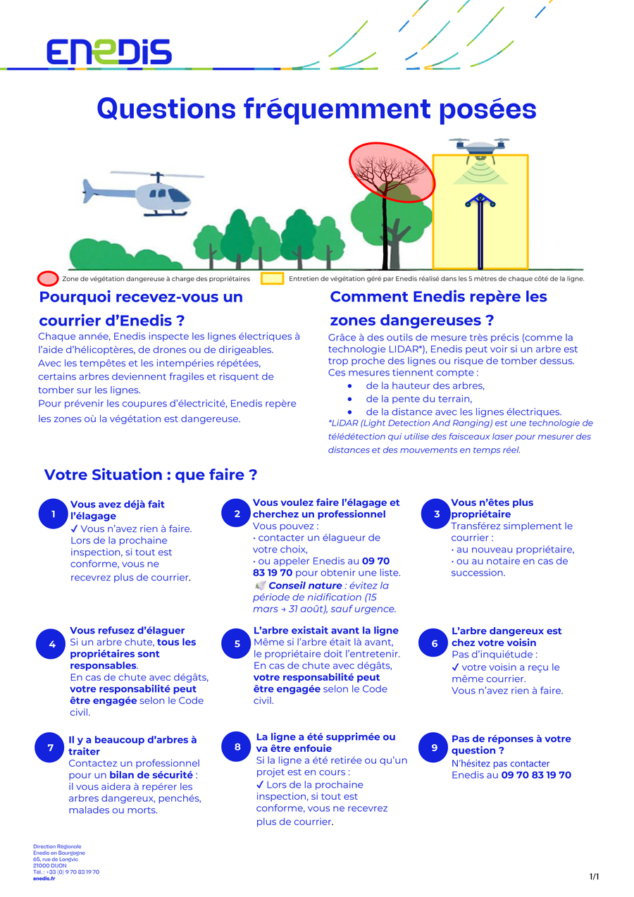 Selon les situations, l’entretien de cette végétation relève soit de la responsabilité d’Enedis, soit de celle des propriétaires. Vous trouverez en pièce jointe une brochure précisant les obligations de chacun.