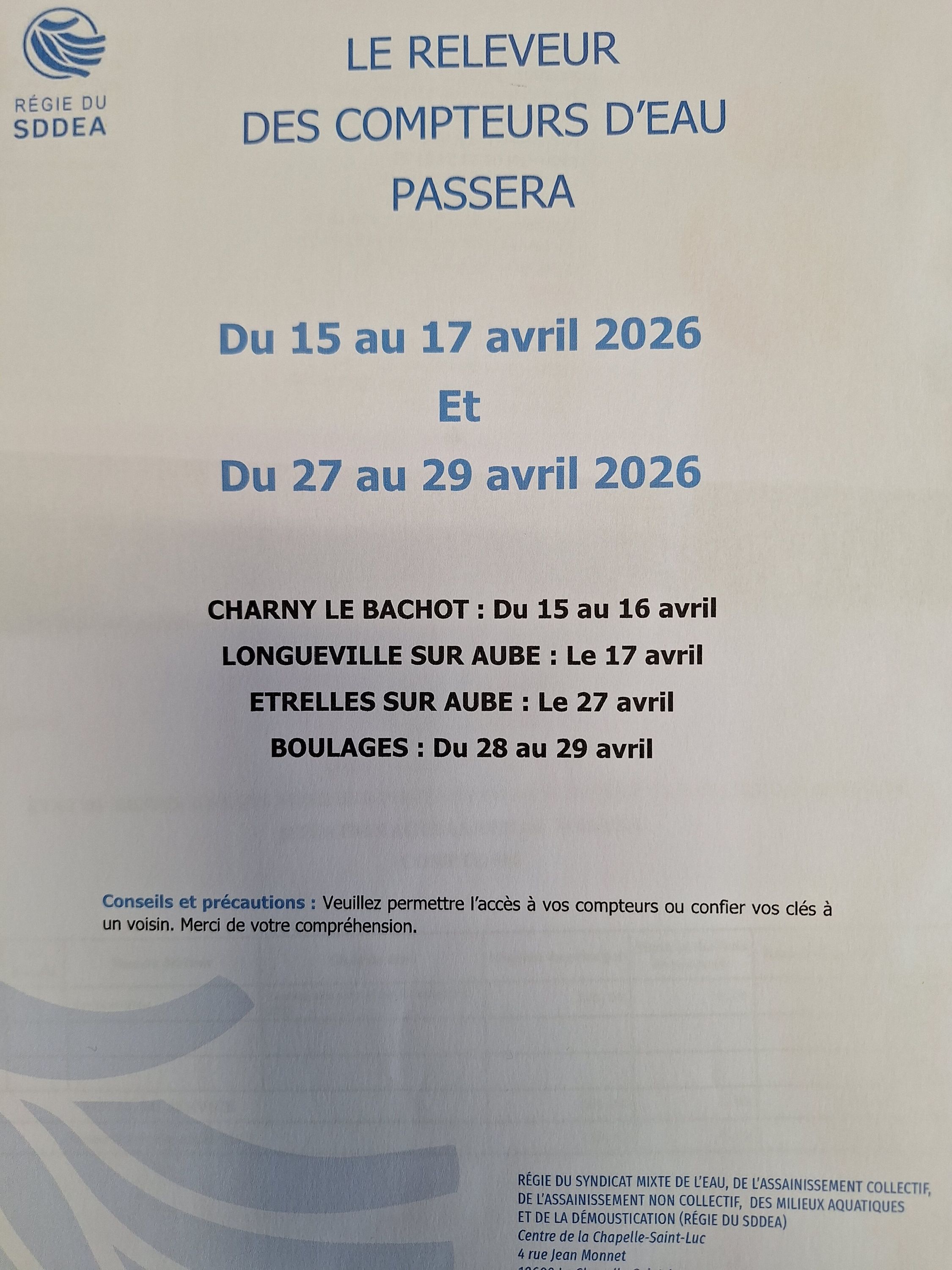 Les compteurs d'eau seront relevés les 15 et 16 avril prochain par la SDDEA.