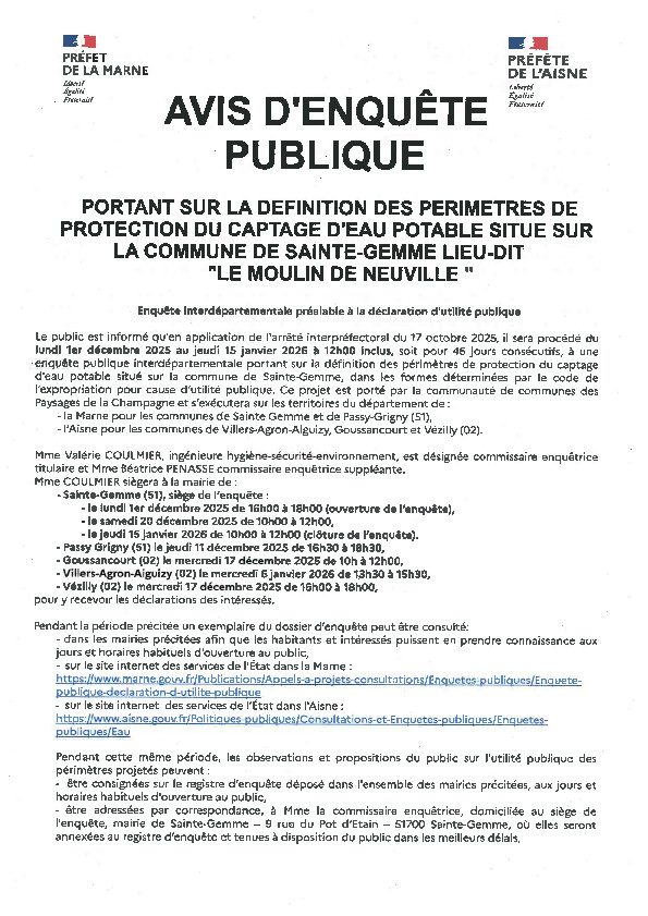 Le dossier d’enquête est également disponible sur les sites des services de l’État de la Marne (https://www.marne.gouv.fr/Publications/Appels-a-projets-consultations/Enquetes-publiques/Enquete-publique-declaration-d-utilite-publique) et de l'Aisne (https://www.aisne.gouv.fr/Politiques-publiques/Consultations-et-Enquetes-publiques/Enquetes-publiques/Eau).