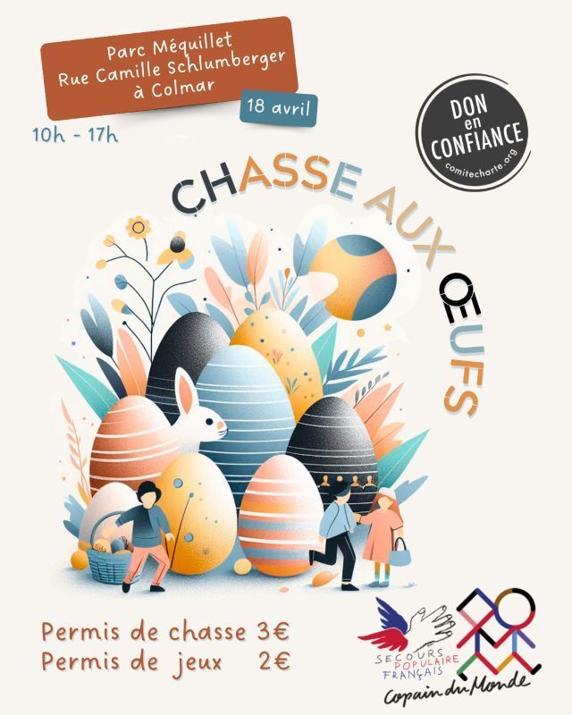 Le Secours populaire français de Colmar a le plaisir d’organiser une chasse aux œufs solidaire le 18 avril prochain au parc Méquillet à Colmar.