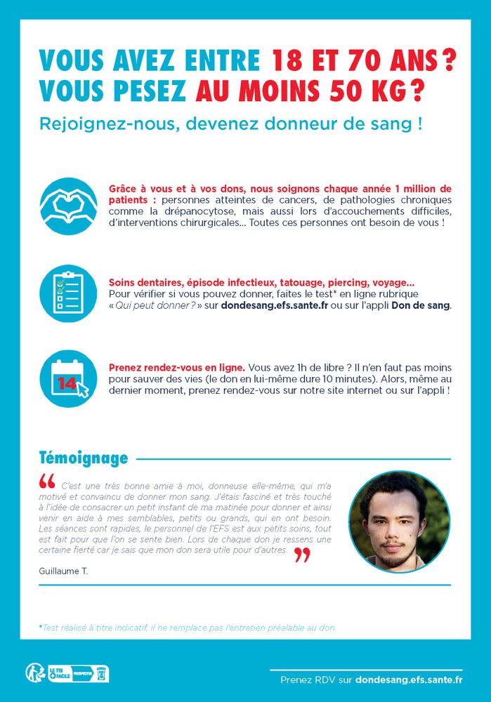 En partageant un moment solidaire, sympas, qui sauve des vies ! 1 000 000 de patients sont soignés chaque année grâce aux dons. Alors, si l’on a tous 1 000 excuses pour ne pas donner son sang ou son plasma, il y a pourtant tant de bonnes raisons pour le faire... Prenez rendez-vous !