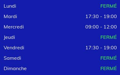 "Courier New";"o VAL DE REUIL : Mardi 17 Mars 2026 de 09h30 à 12h30
