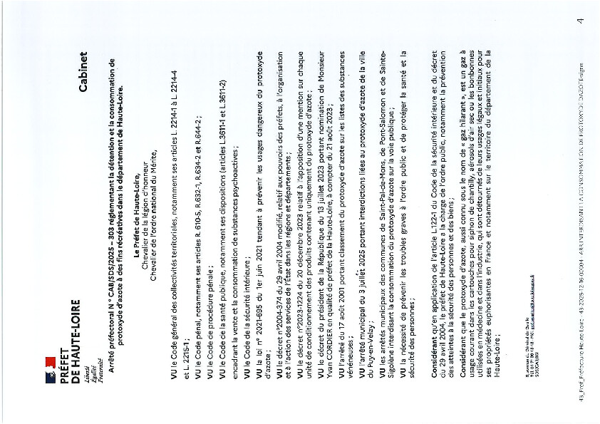 Veuillez trouver ci-dessous l'arrêté préfectoral réglementant la détention et la consommation de protoxyde d'azote à des fins récréatives dans le département de la Haute-Loire.